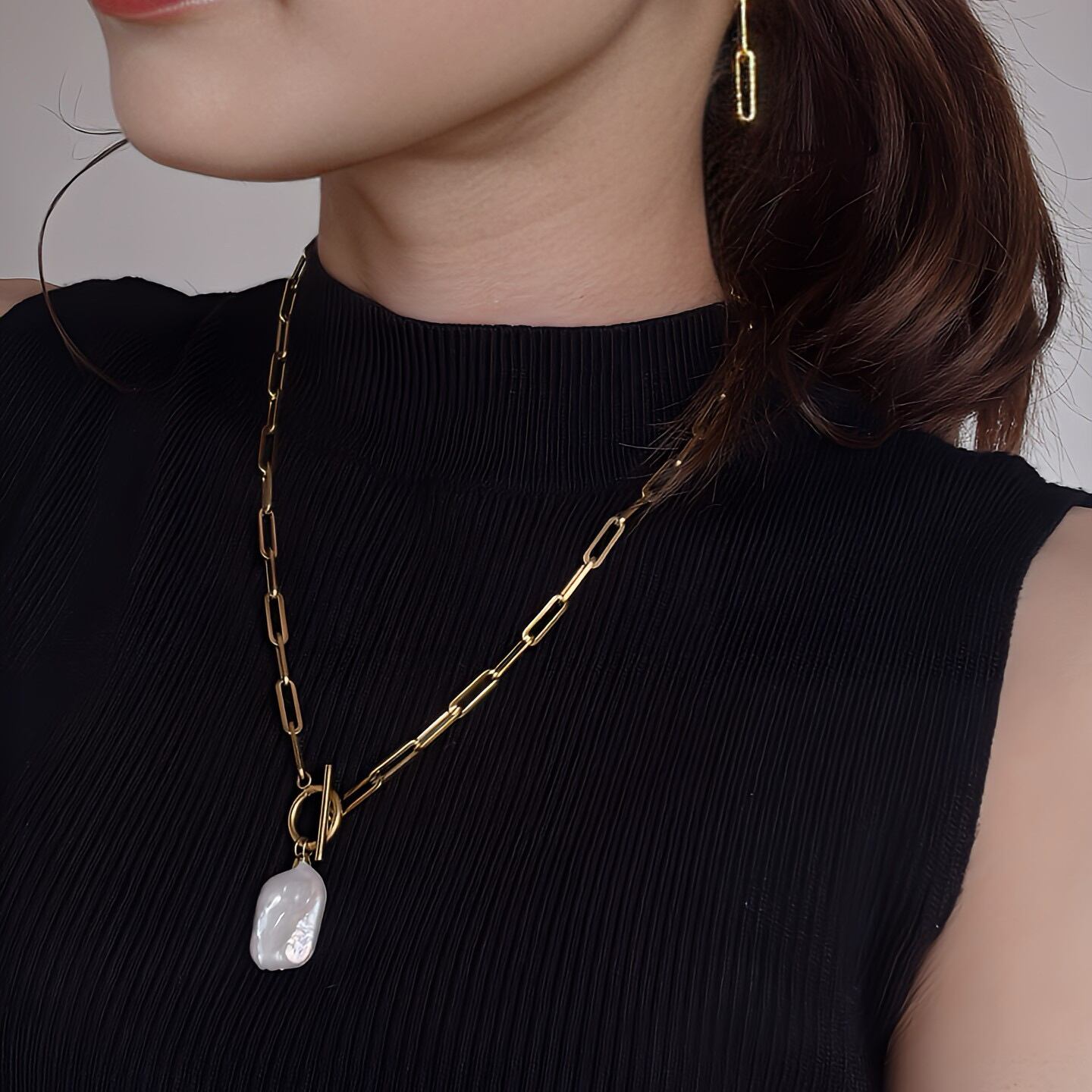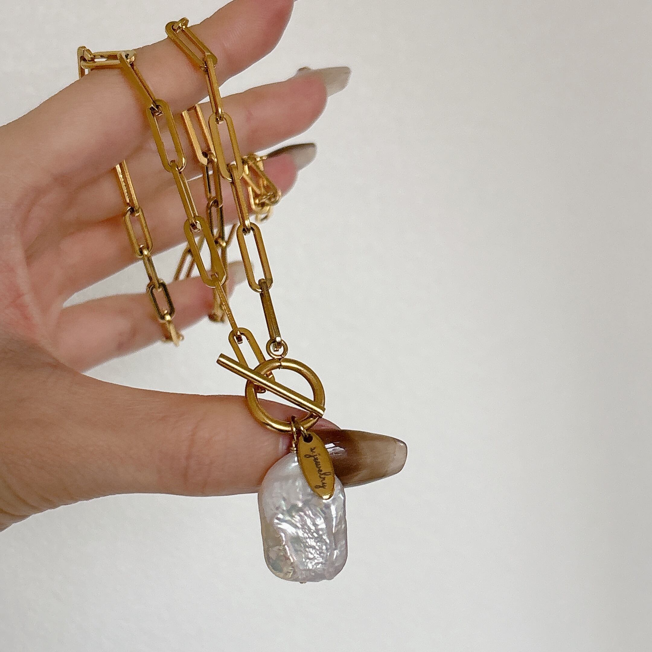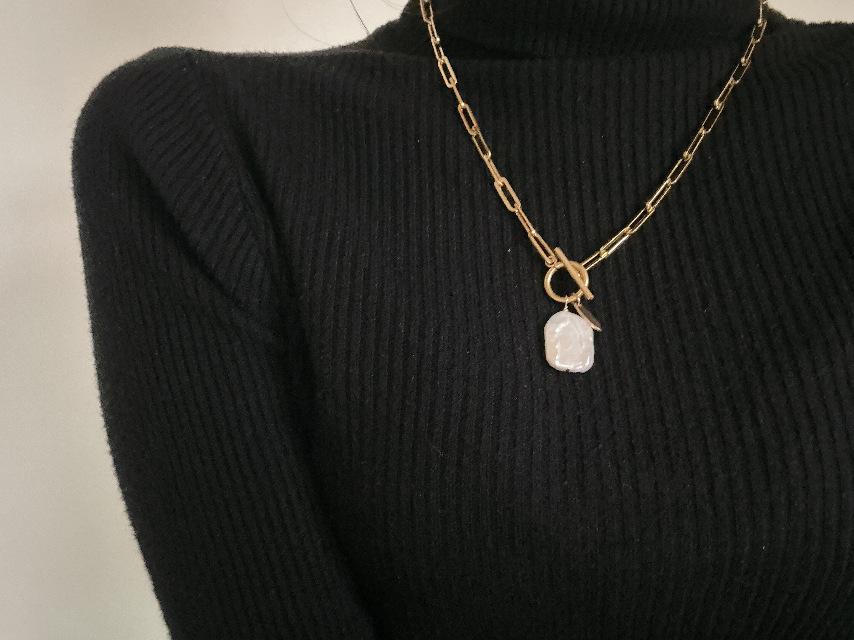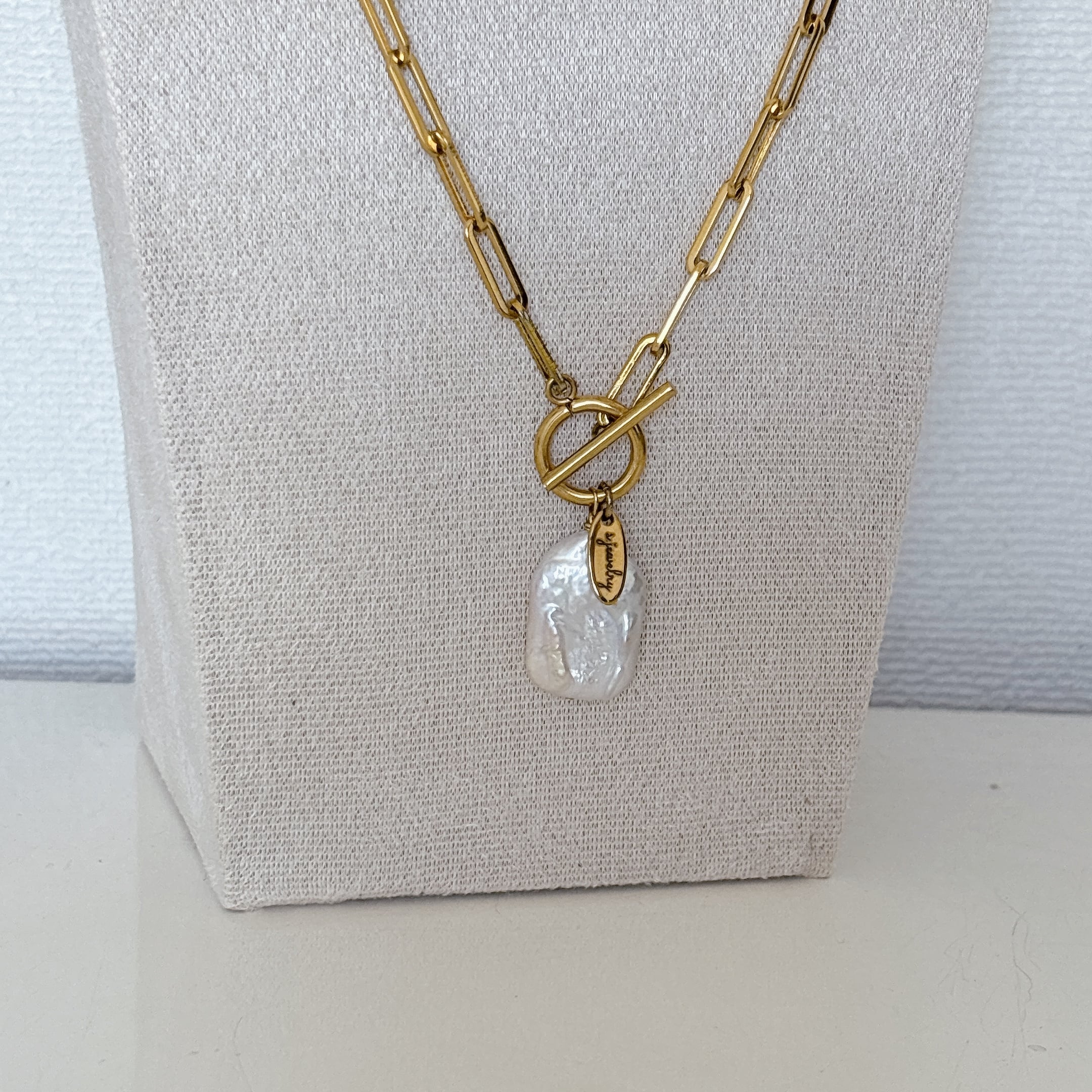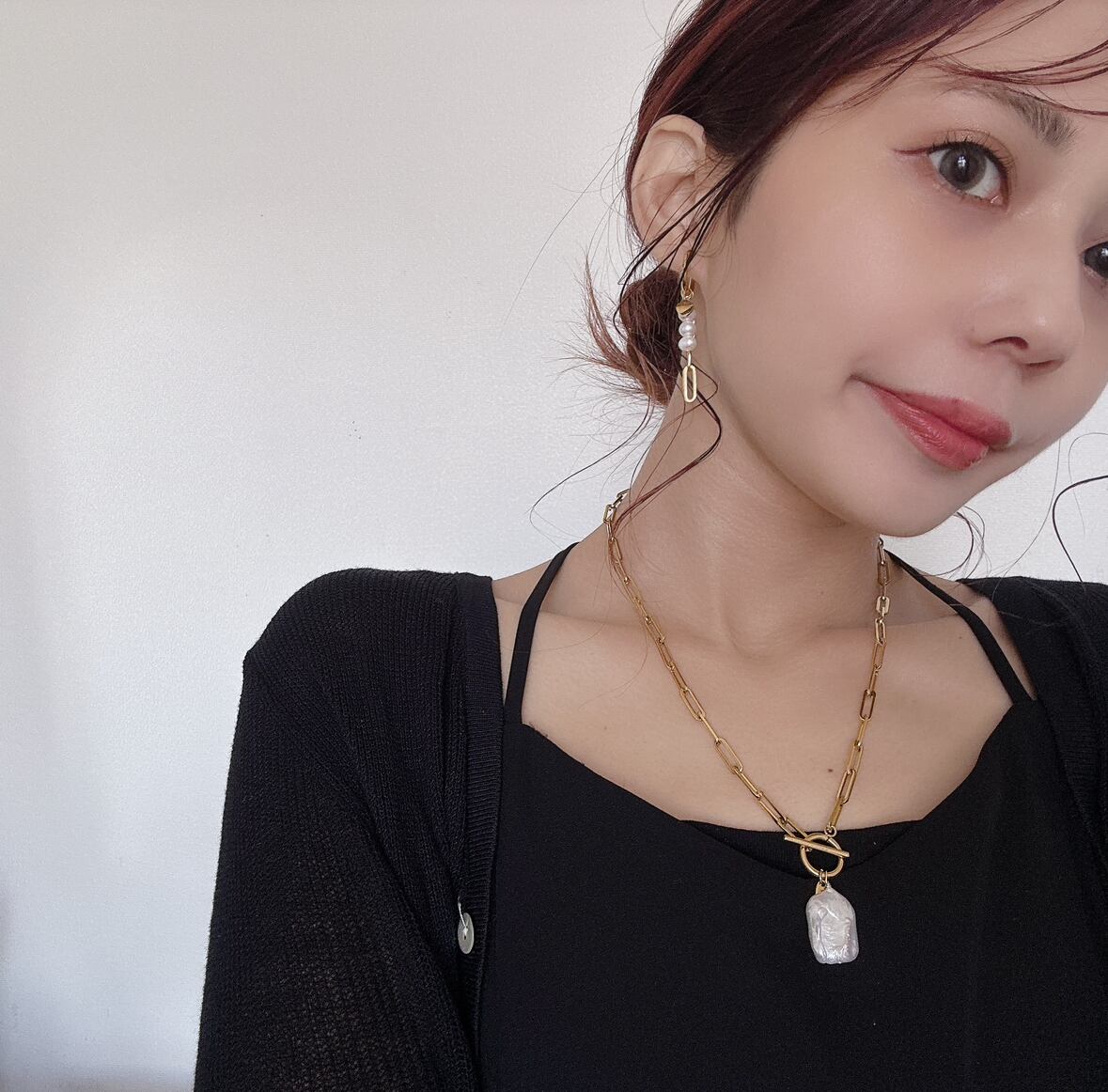 存在感のあるワイドチェーン×大振りな淡水パールのインパクトあるデザインです。シーズンレスに、首元が嵩張るお洋服にも、すっきり首元が空いているお洋服どちらにも合わせやすい大人カジュアルデザイン。