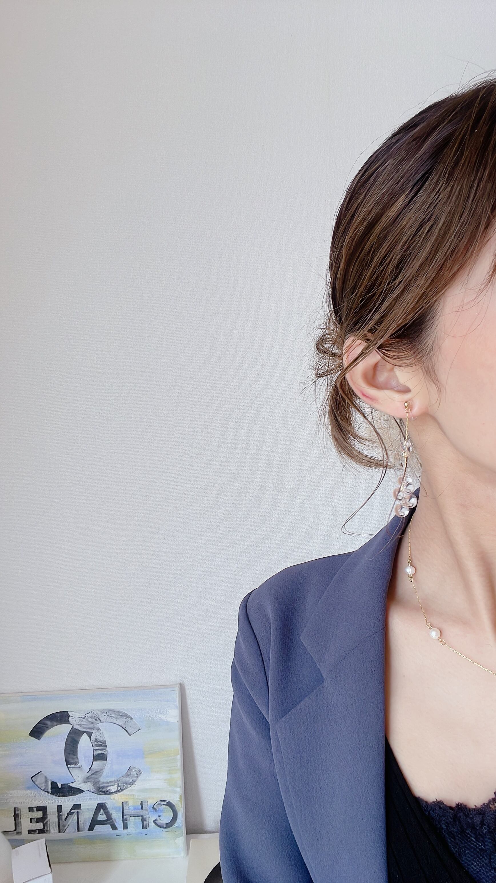 長めのピアスですが、シンプルなデザインで軽量なデザインがまま負担を減らし楽しむことができるアクセサリー。上品な揺れと、透明感を楽しめて季節問わず、エイジレスに♩