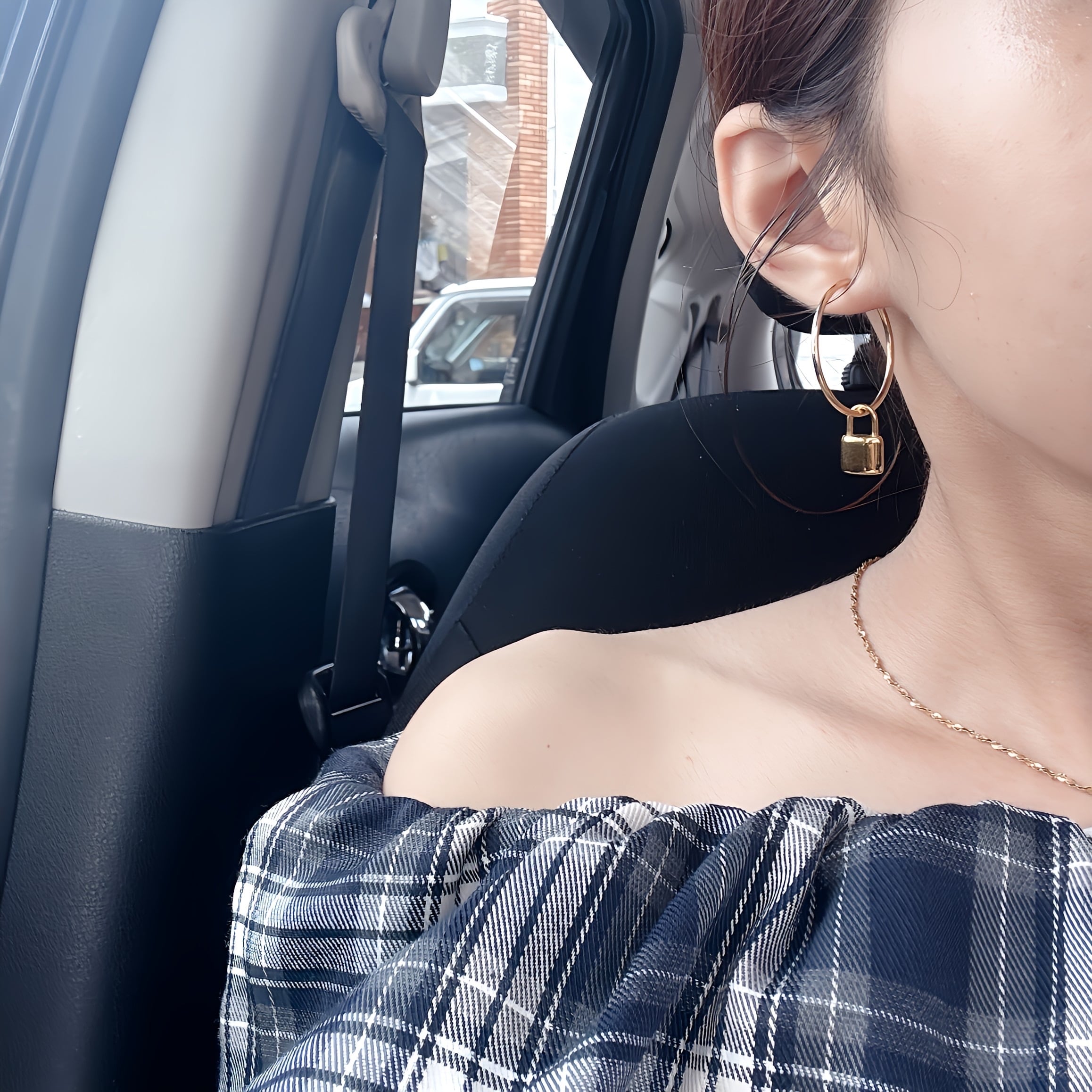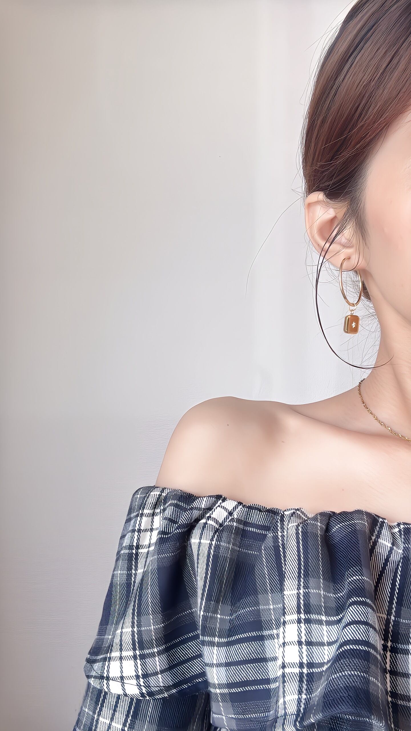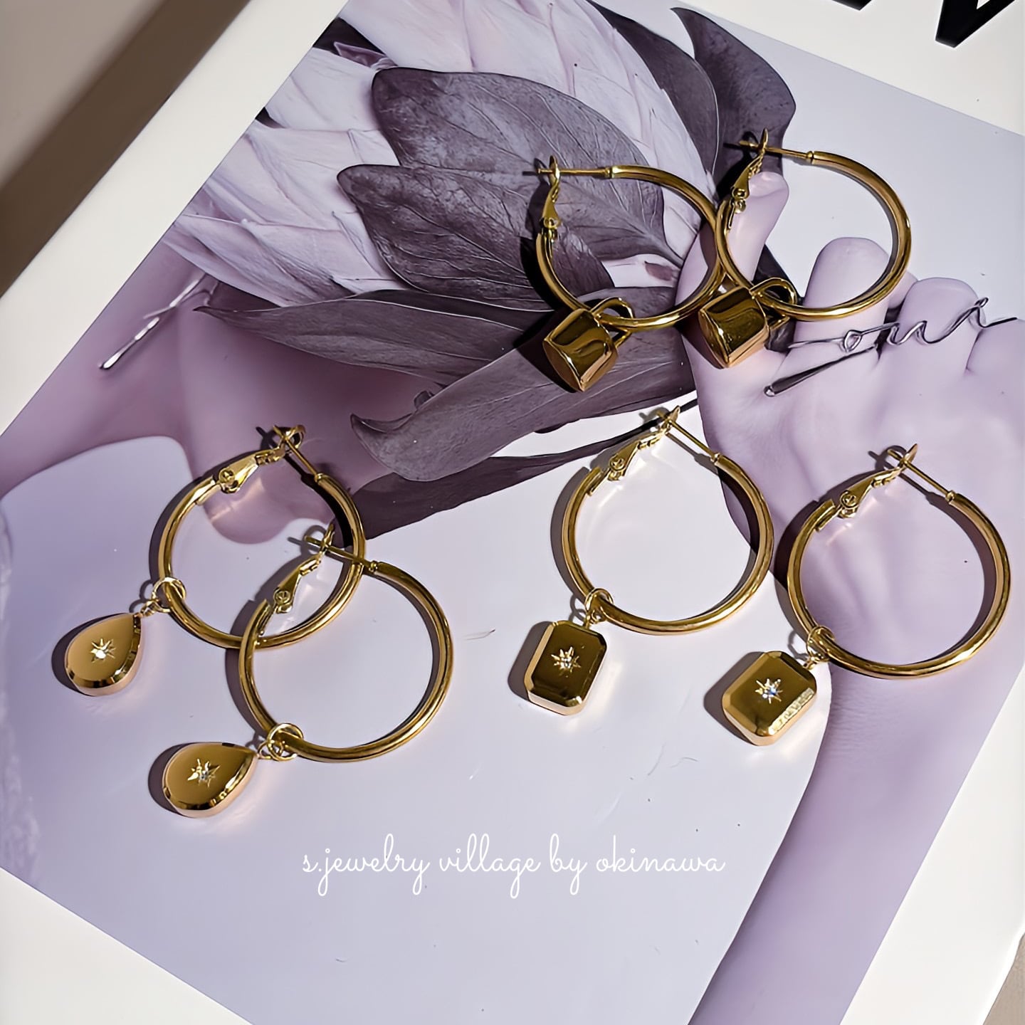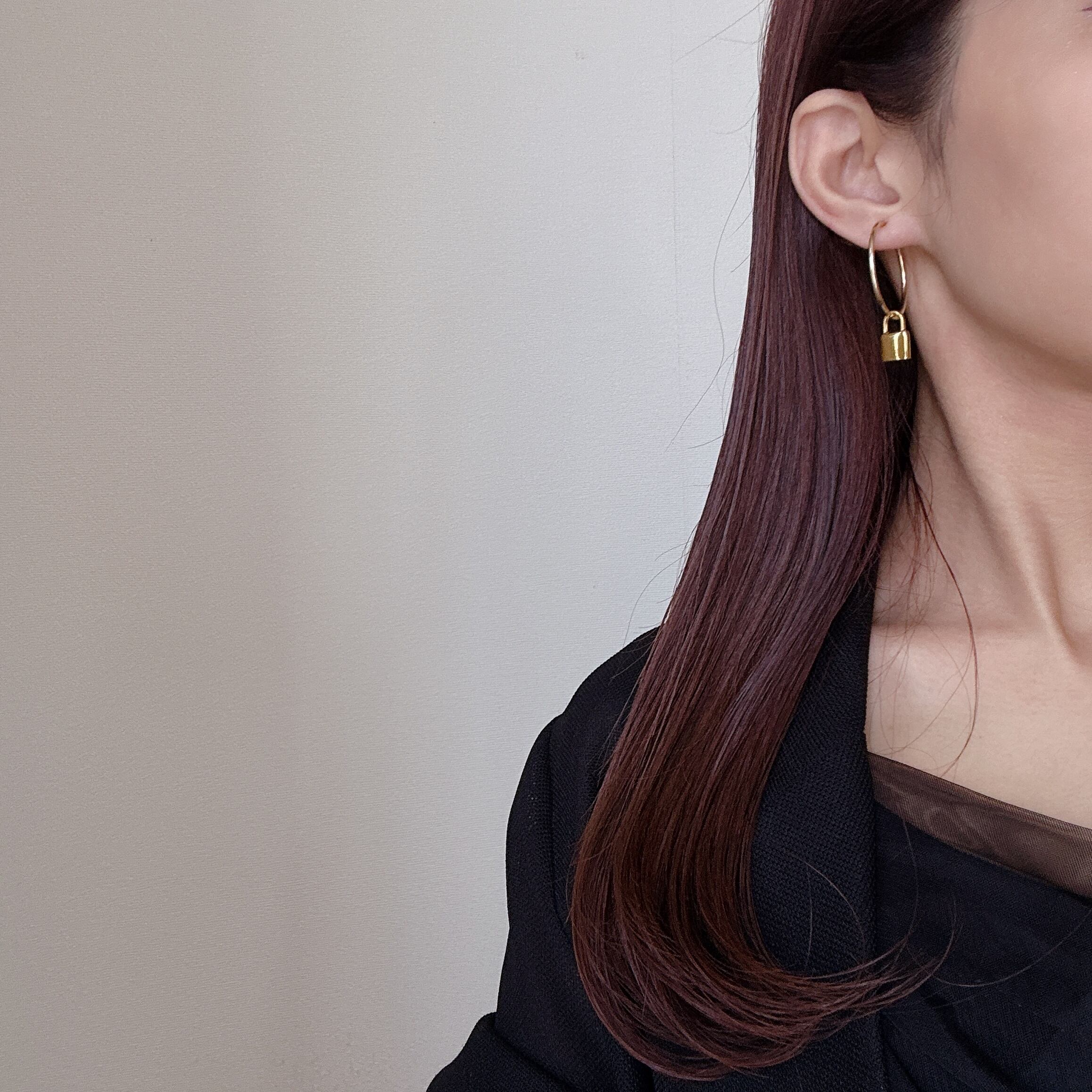 シンプルなゴールドフープに、小ぶりのチャームを組み合わせた大人顔デザイン。
