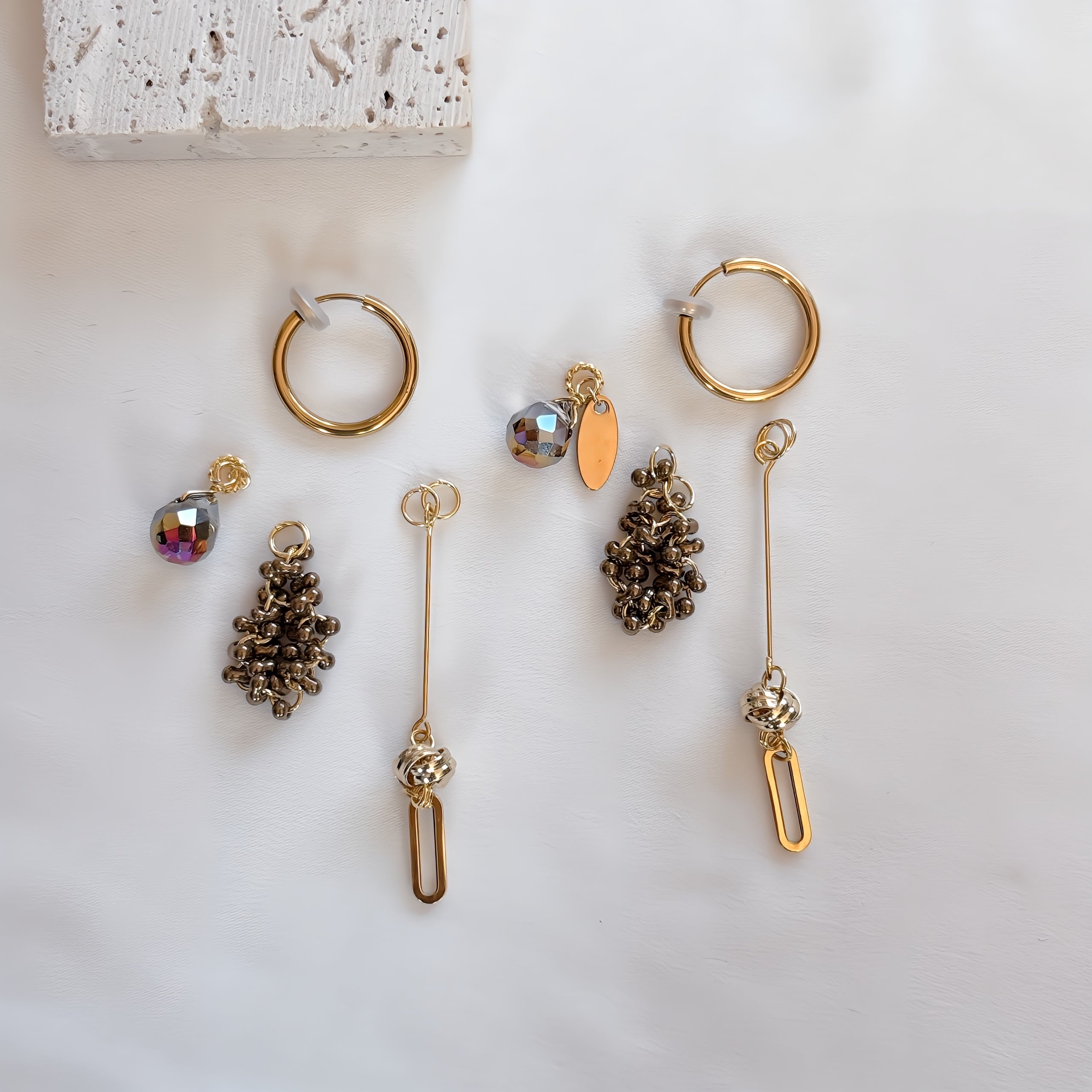 カジュアルに小ぶりデザイン / シンプルなお洋服に大振りなデザイン / 目的、行く場所に合わせてチャームを付け替えができる万能ピアス!