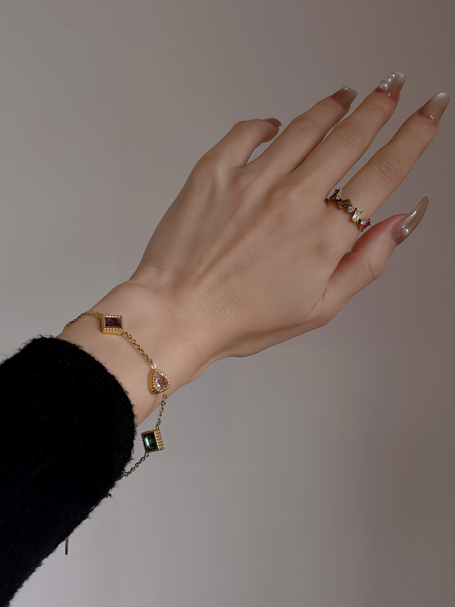 ワンポイントになるカラフルビジューと華奢なラインが大人デザインのセレクトリング。