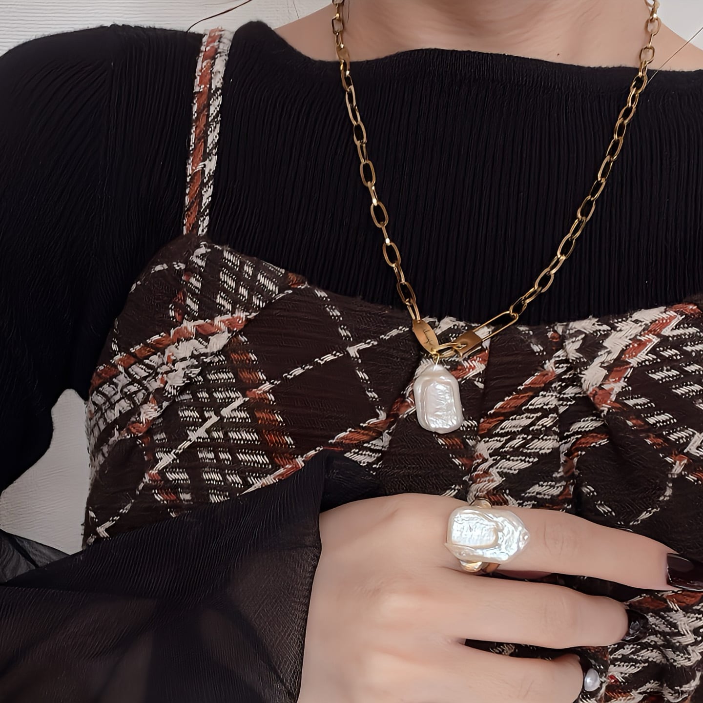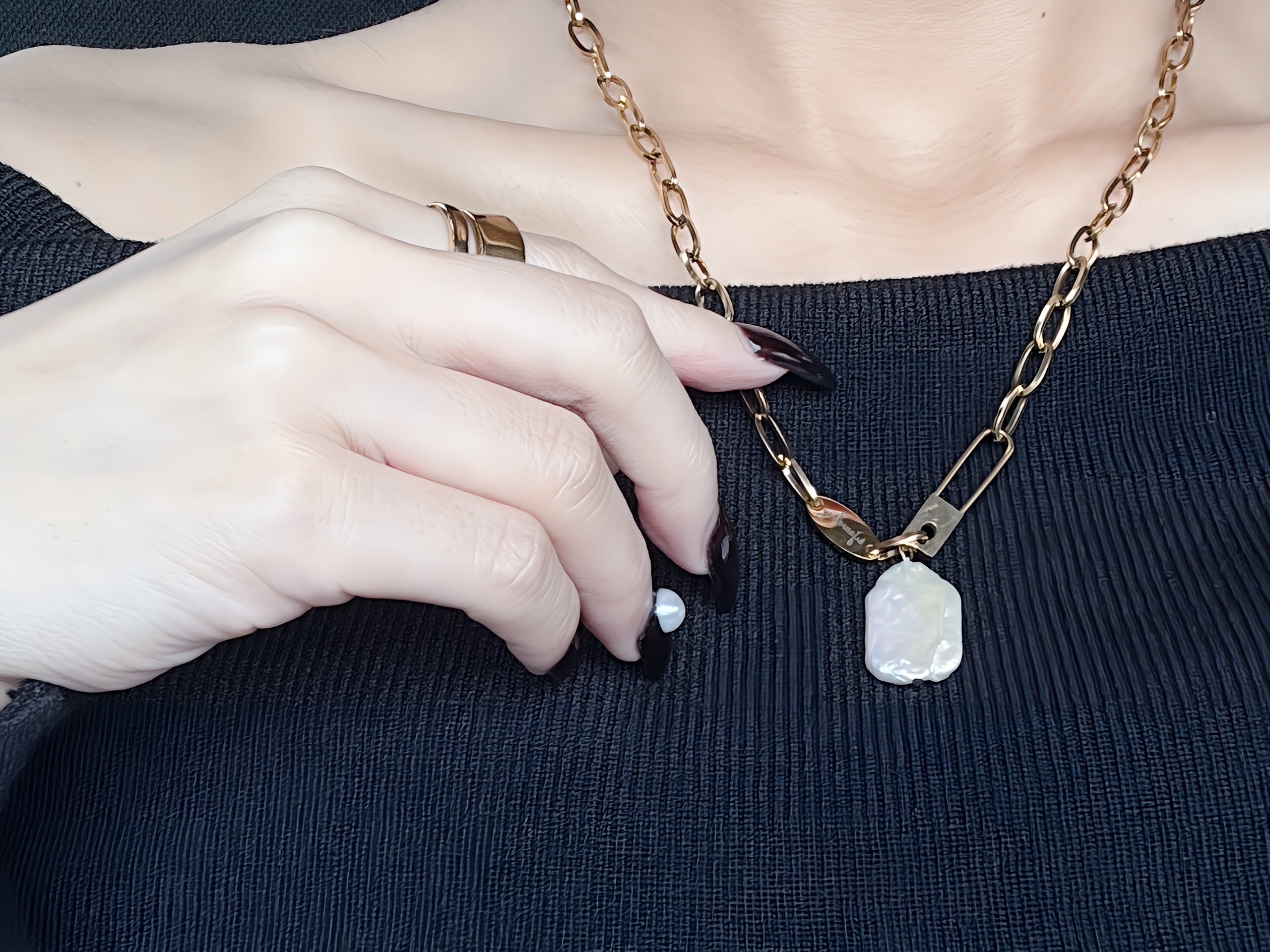 存在感のあるワイドチェーン×大振りな淡水パールのインパクトあるデザインです。シーズンレスに、首元が嵩張るお洋服にも、すっきり首元が空いているお洋服どちらにも合わせやすい大人カジュアルデザイン。