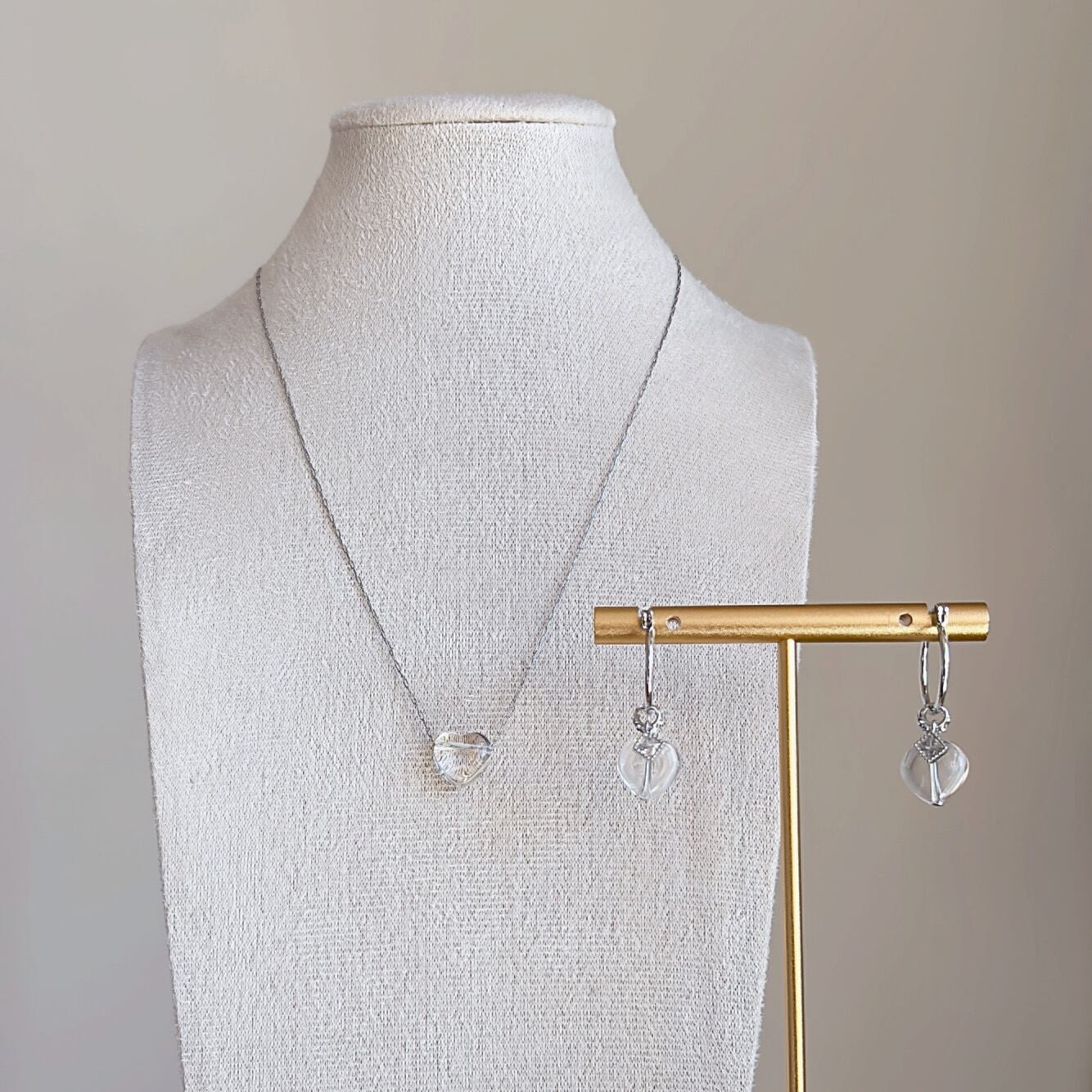 ぷっくりハート型のクリスタル(水晶)使用。フォルムがさりげないハートなので甘くなりすぎず楽しめるハートシリーズ♡透き通る水晶がほど良い存在感、Tシャツにもブラウスにも自然に馴染む万能デザインです。