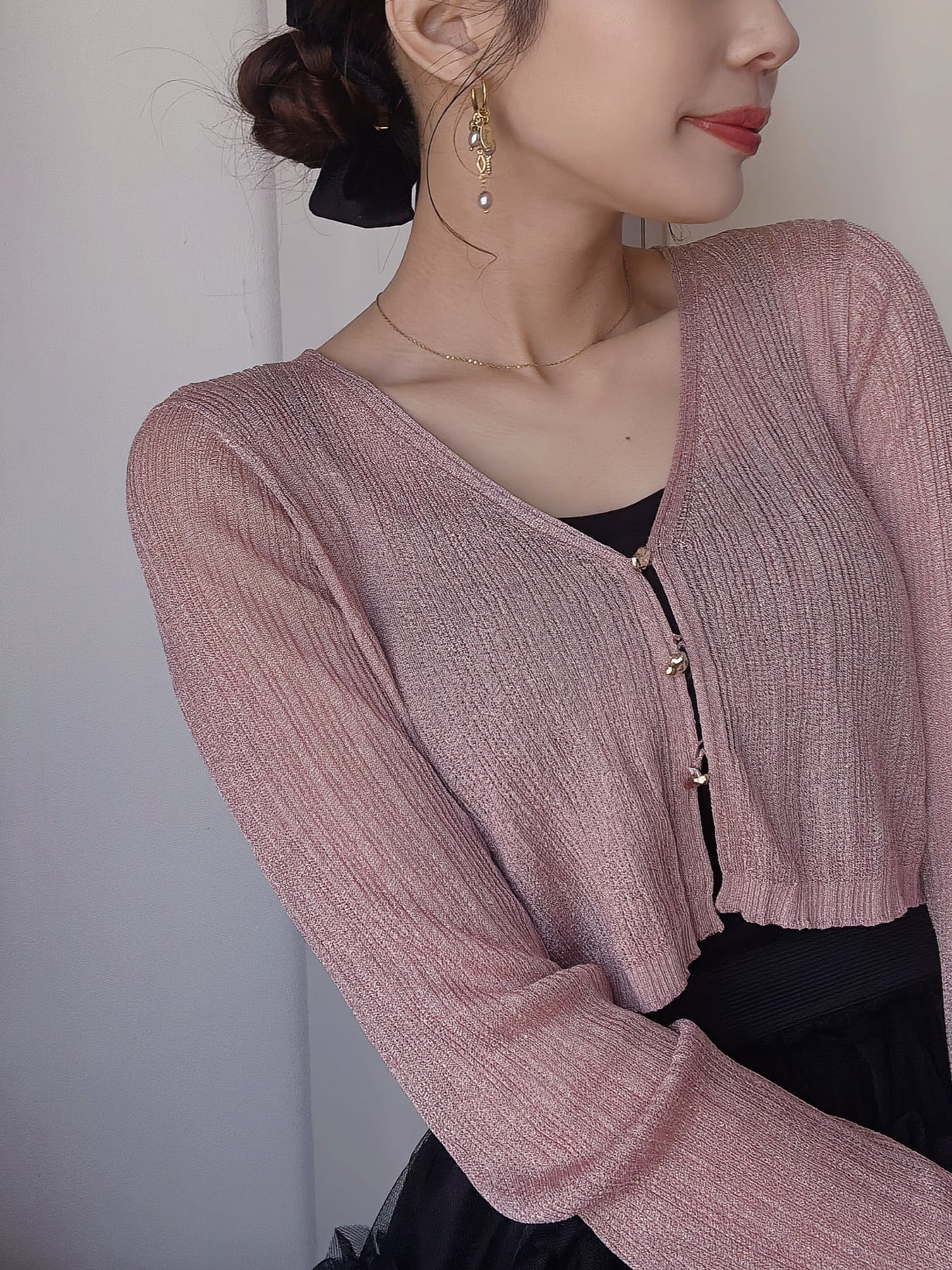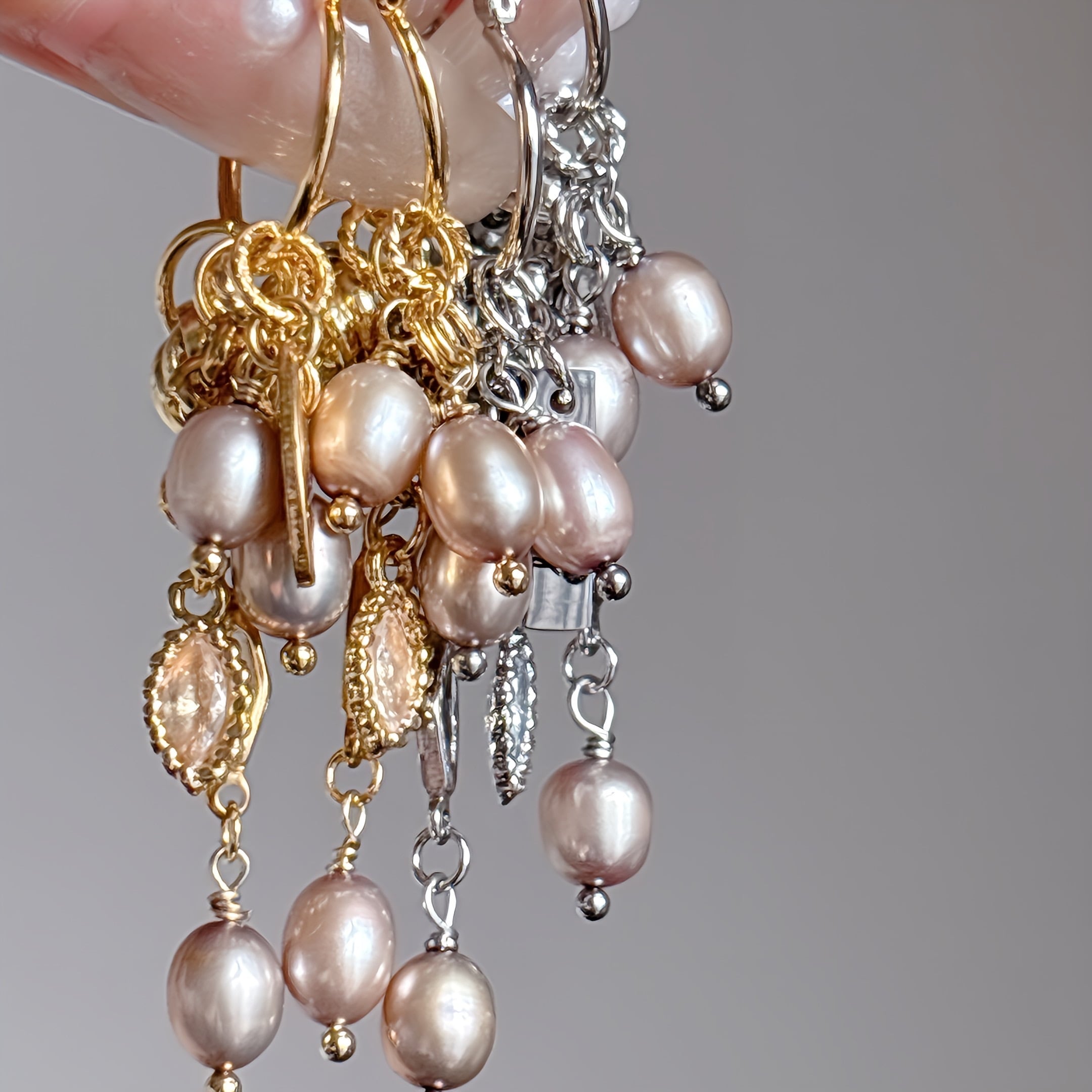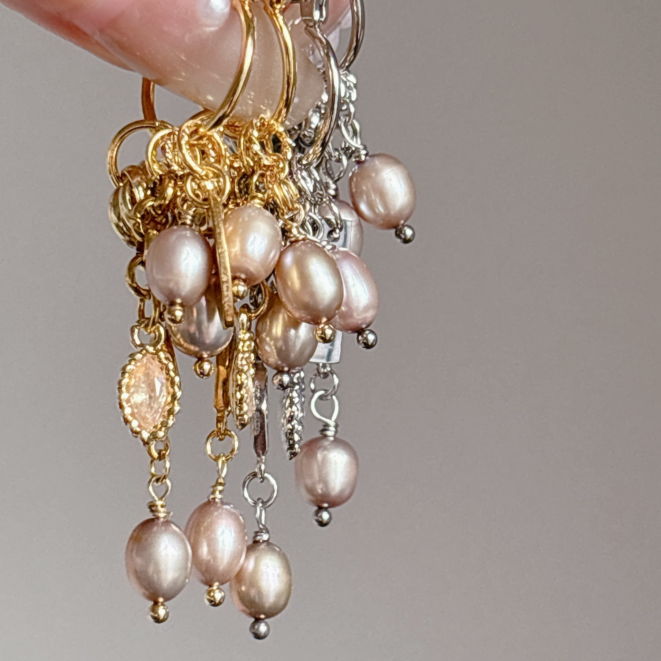 肌馴染みのいい色味と繊細なパールが重なり合う、華やかさと上品さを兼ね備えたシャワーパールピアス。動くたびに揺れるパールが、お顔まわりをぱっと明るく見せてくれます。
