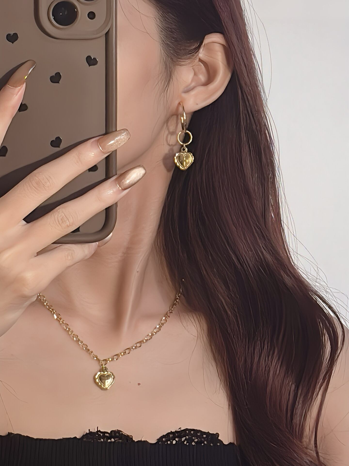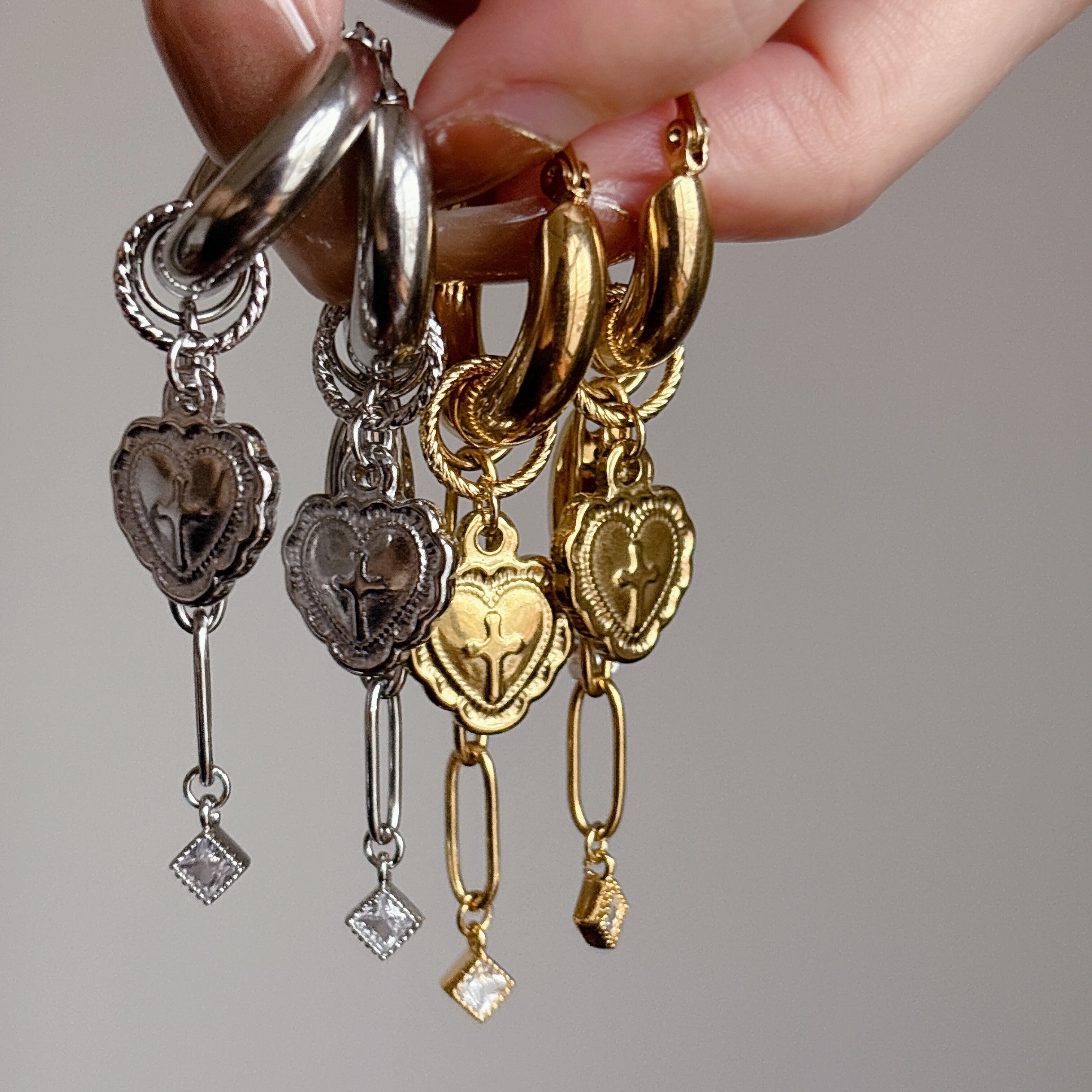 存在感のあるハートモチーフに、程よく馴染みやすい大きめチェーンのカジュアルにも綺麗めにも馴染む、バランスのいいデザイン。甘さのあるハートデザインも、太めのフープピアスが大人カジュアルに。