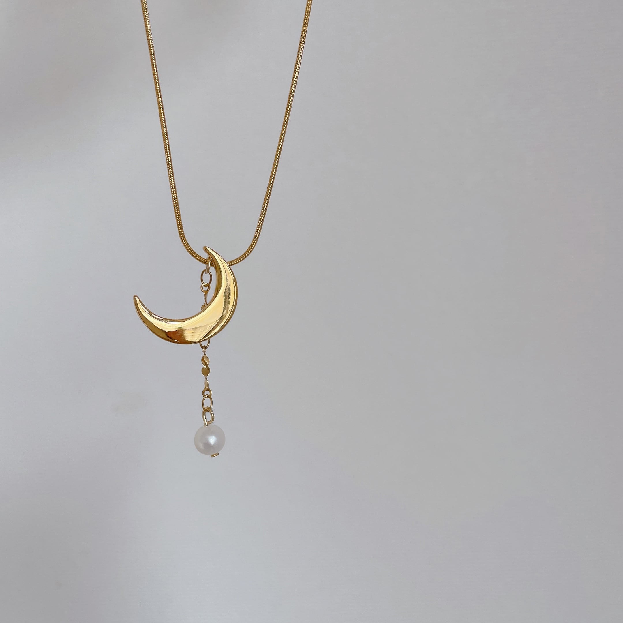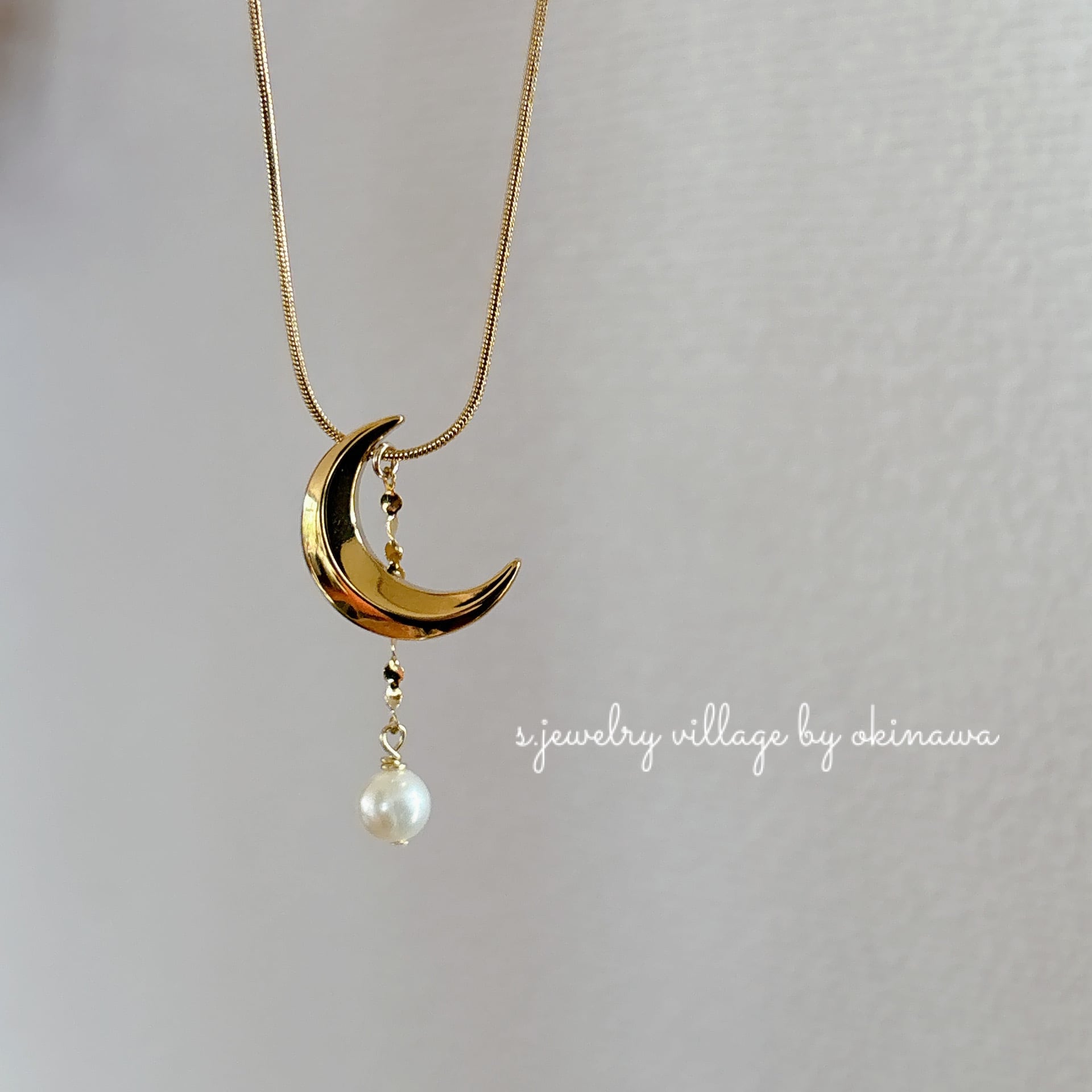 淡水パール×月モチーフネックレス|揺れる上品さと神秘感【金属アレルギー対応】
