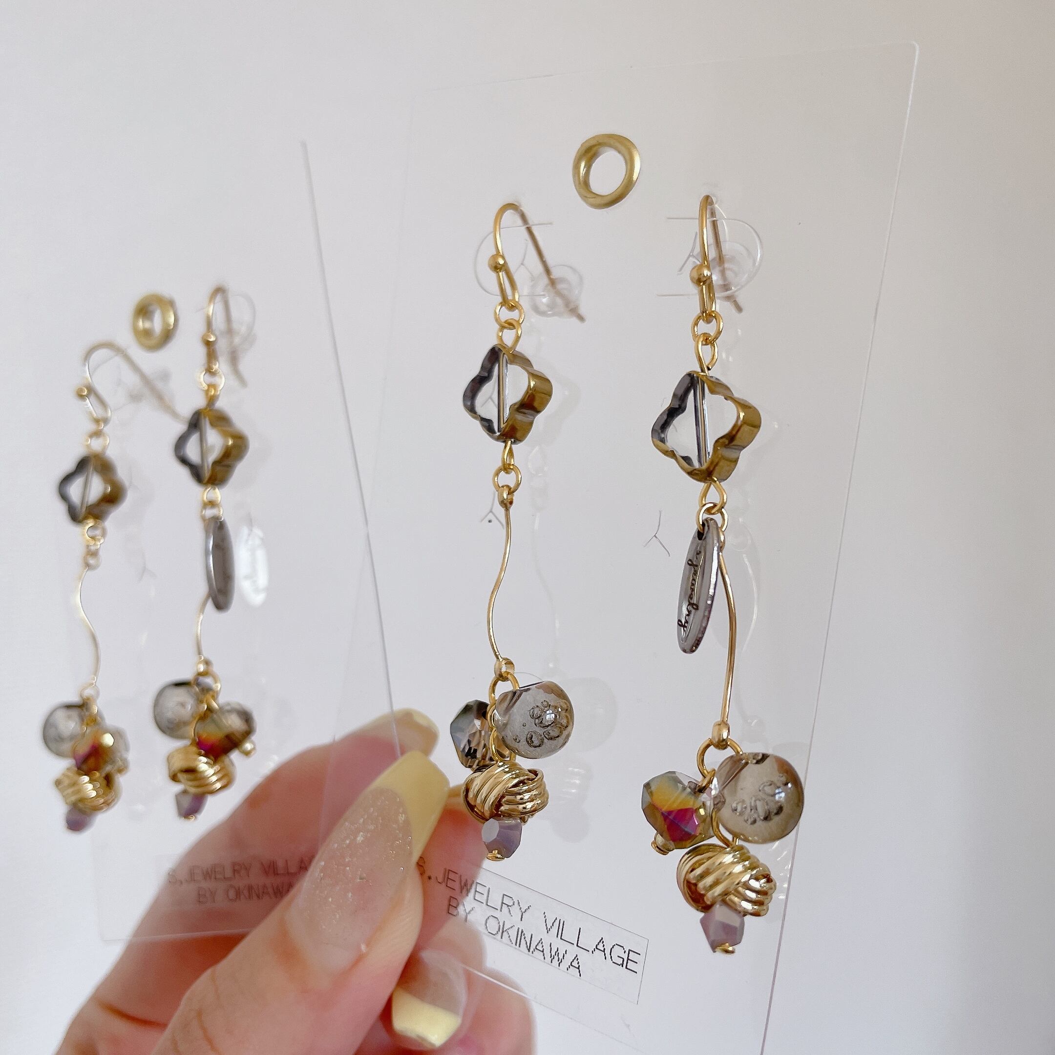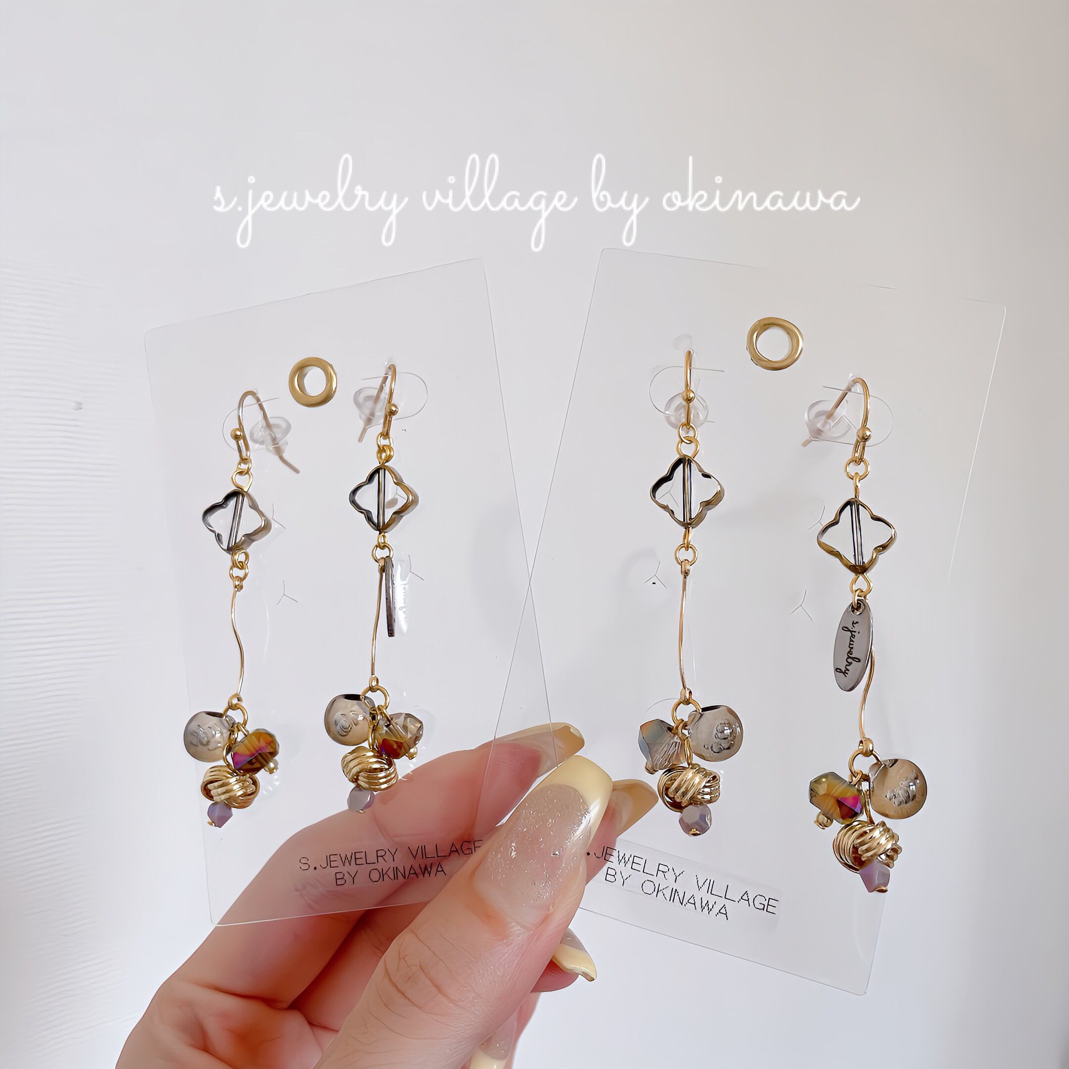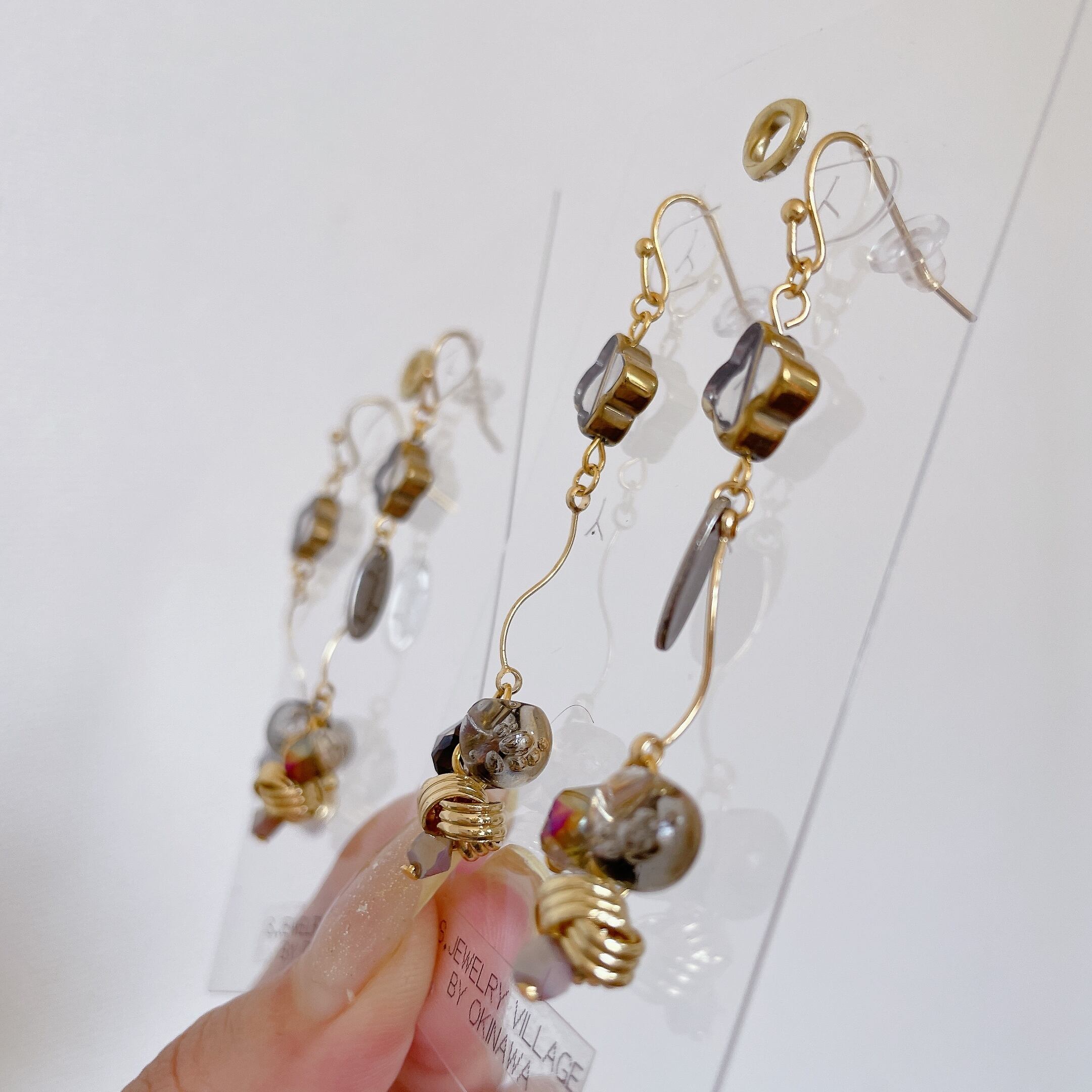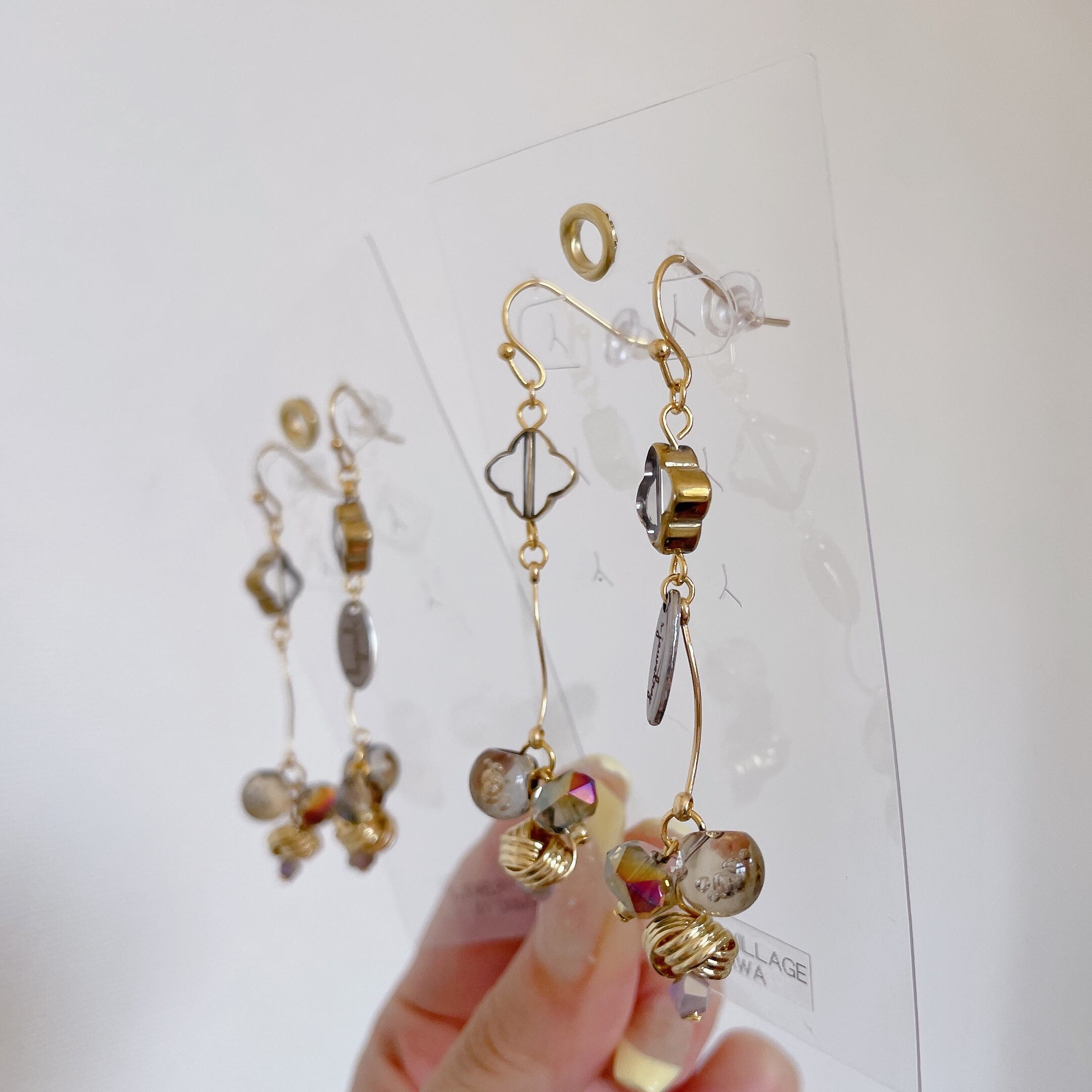 クローバービーズと目惹くグレー系のビーズがポイントのゆらりピアス♡ダークカラーのお洋服のアクセントに♡