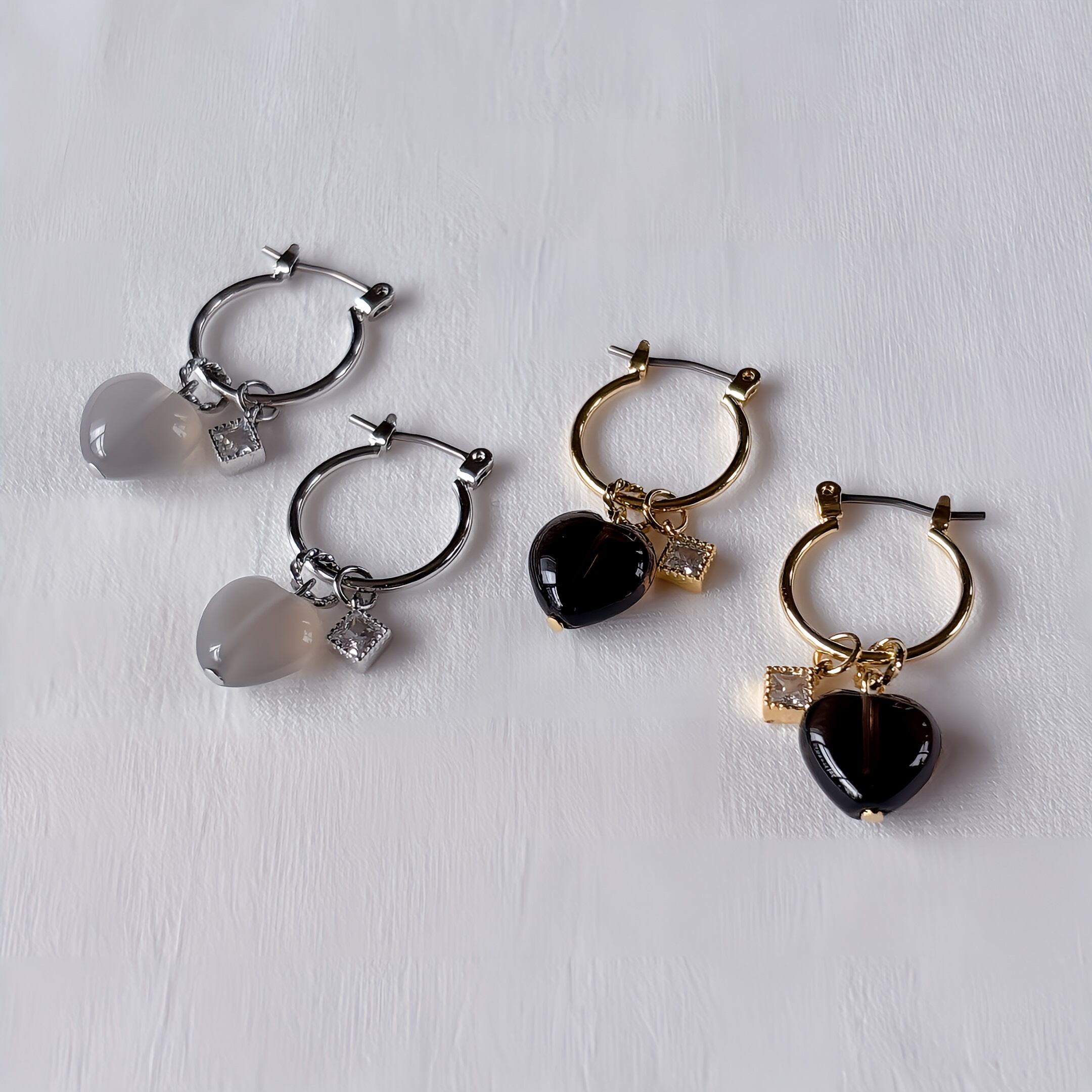 ぷっくりな天然石のハートピアス♡スモーキークォーツとグレームーンストーンの2種類をご用意しています!こちらも3wayで楽しめるので画像確認してみてください♡